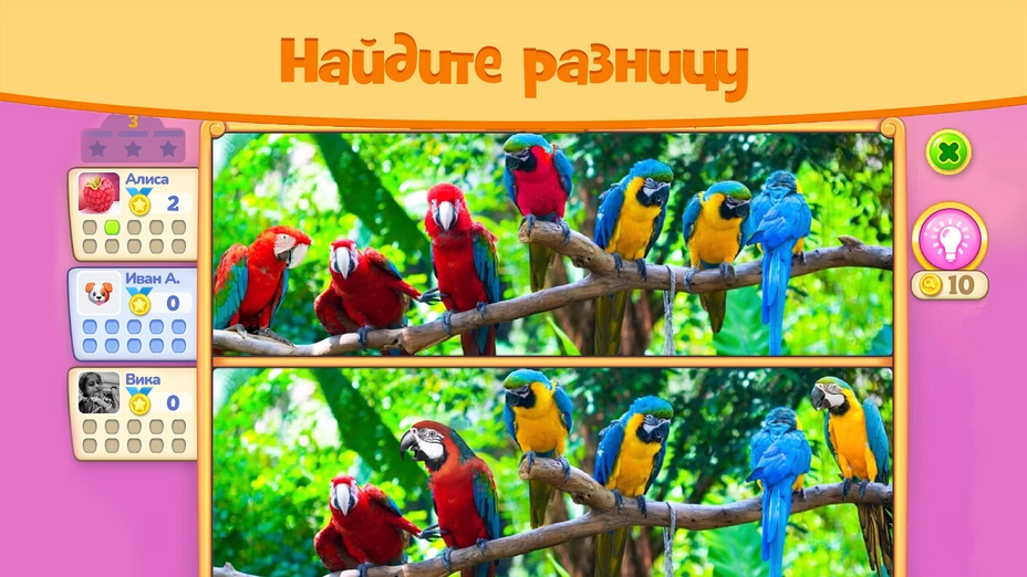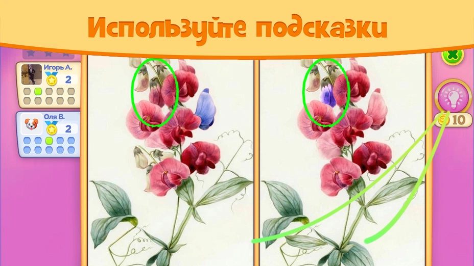 - 💡 Полезные подсказки — если застряли и не можете найти последнее отличие, можно воспользоваться подсказкой. Она подсветит одно из различий, но тратьте их с умом!